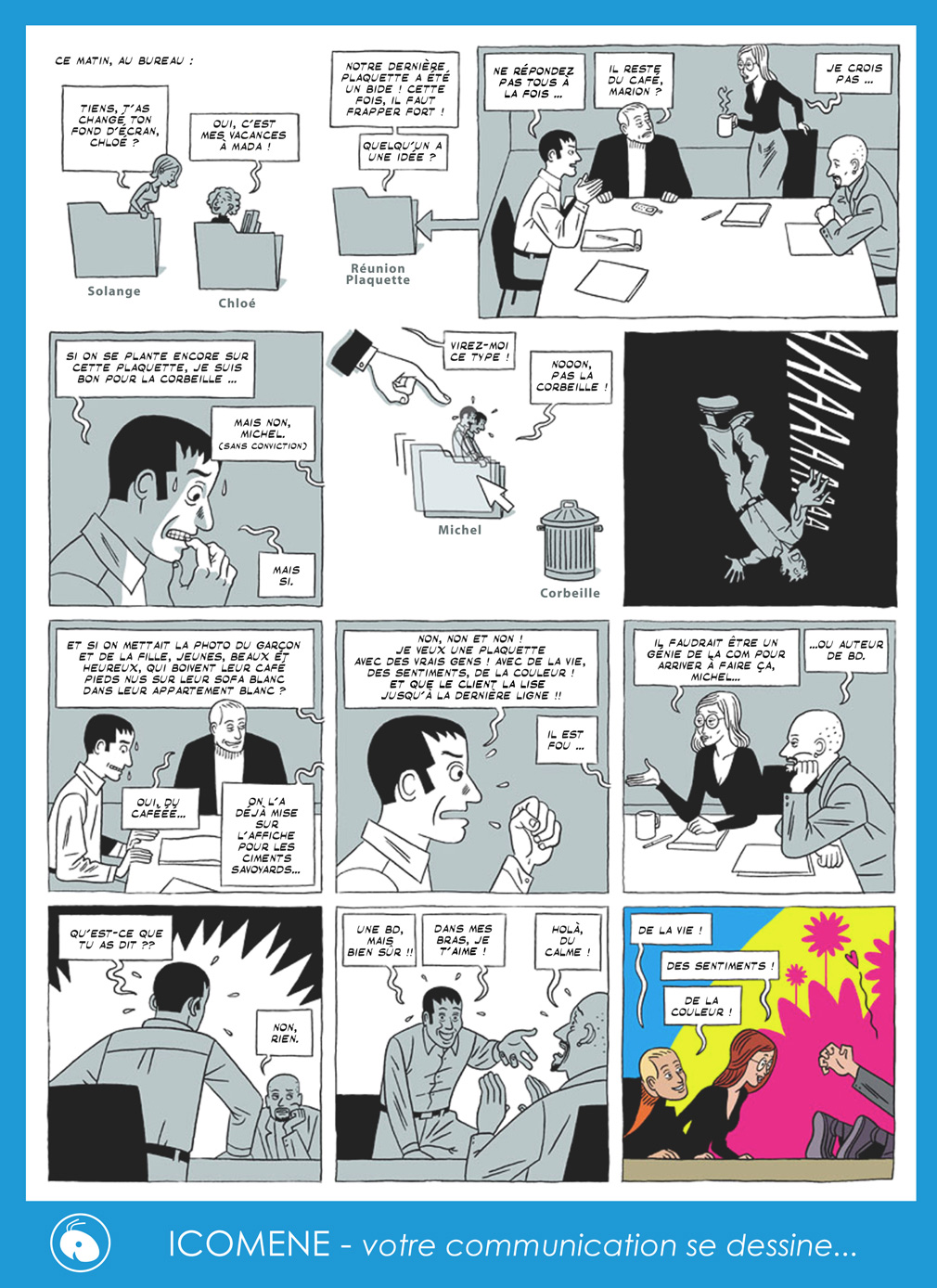 Créée en 2006 par Raphaël Jansem, Icomene est une agence qui place la créativité au coeur de ses actions et associe avec justesse communication et arts graphiques. Réseau unique de compétences multiples, Icomene réunit une palette d’experts : dessinateurs, scénaristes, infographistes, monteurs ou encore développeurs. Forts de notre connaissance solide de l'entreprise, des secteurs économiques et de leurs enjeux, nous traduisons toute problématique institutionnelle en réponse originale, esthétique et impactante. Cet atout spécifique associé à notre expérience, garantissent la qualité de notre travail et son adéquation avec les demandes de nos clients.